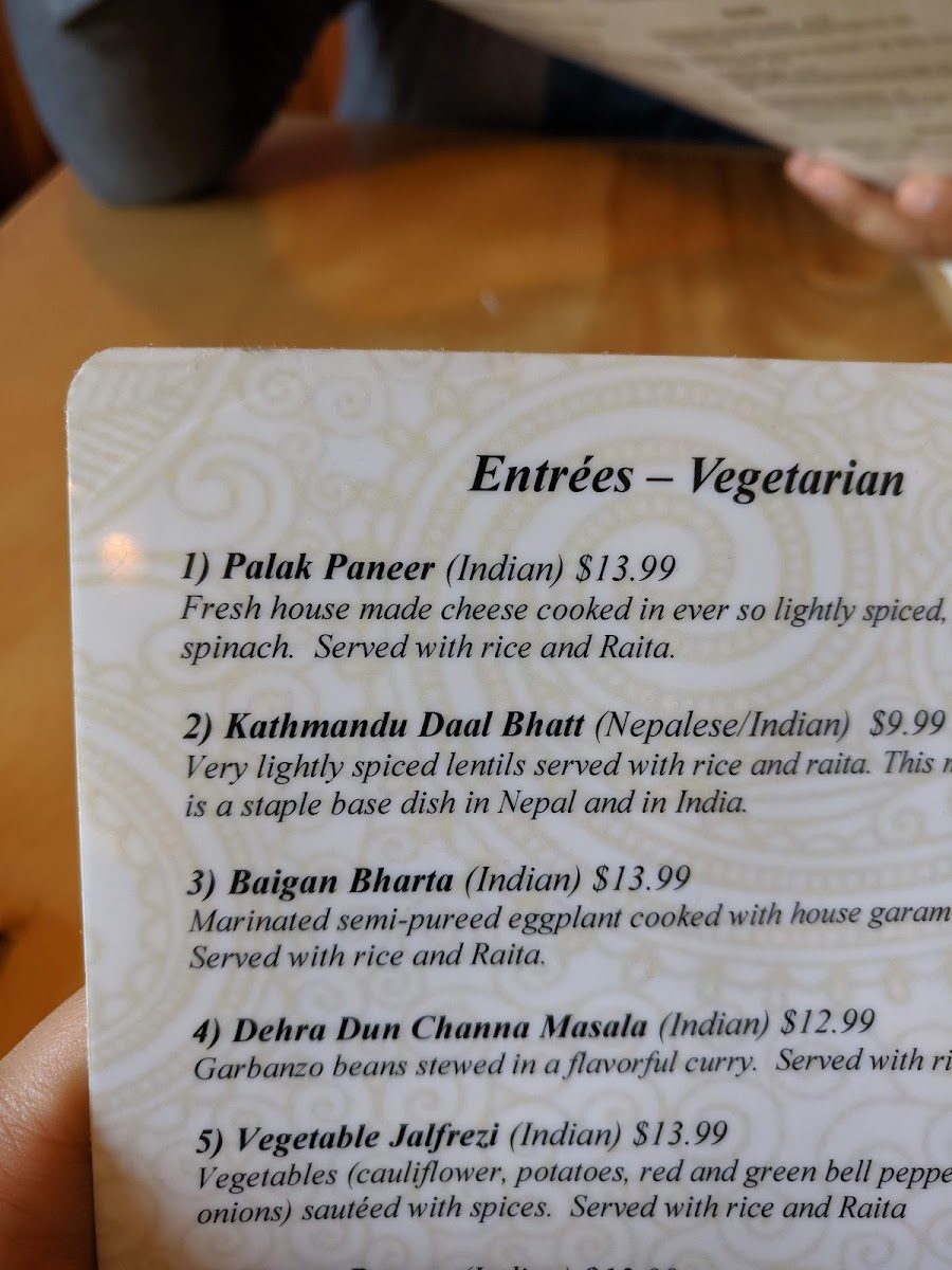 For main courses, there are a variety of vegetarian options such as the Palak Paneer (Indian, $13.95), Kathmandu Daal Bhatt (Nepalese/Indian, $12.95), and Baigan Bharta (Indian, $14.95), each delivering comforting and hearty flavors. Dehra Dun Channa Masala (Indian, $13.95) and Vegetable Jalfrezi (Indian, $13.95) offer a great mix of spices and vegetables for those seeking plant-based dishes.